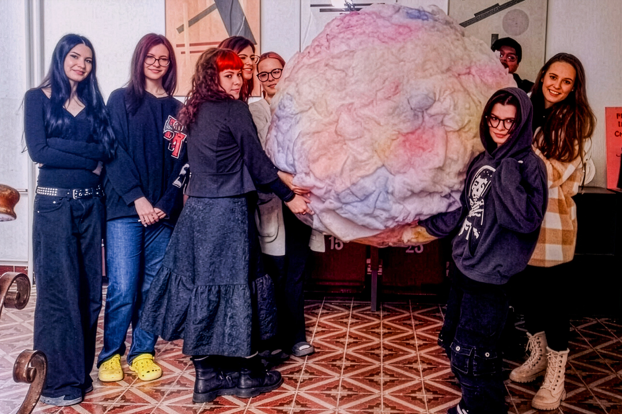 Socha je poctou základní lidské touze – cítit radost, blízkost a bezstarostnost. Studenti se rozhodli ztvárnit ŠTĚSTÍ odvážně, hravě a s plnou barevností mladé imaginace: jako velkou chlupatou kouli, která nepředstírá nic víc, než že je sama o sobě radostným objektem – měkkým, veselým a přístupným.